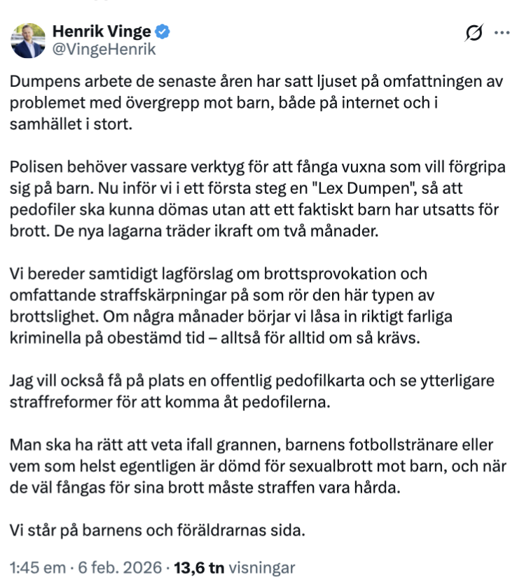 ”Vi betalar Dumpens kostnader. Lagen ska inte skydda pedofiler från upptäckt. Jag har idag bidragit med en summa till Dumpen efter gårdagens förtalsdom mot Sara Nilsson. Det är i första hand en symbolisk gest för att visa mitt och Sverigedemokraternas stöd för verksamheten, men det kommer mer”, skriver partiledare Jimmie Åkesson på Facebook.