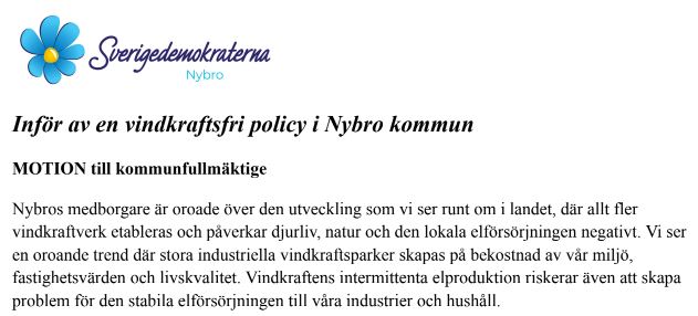 I motionen föreslår Sverigedemokraterna att Nybro kommun utnyttjar sitt kommunala veto mot vindparker kring Kråksmåla och Gårdsryd. För att skydda naturen, lokalsamhället och industrin vill man även se att en vindkraftsfri policy införs.