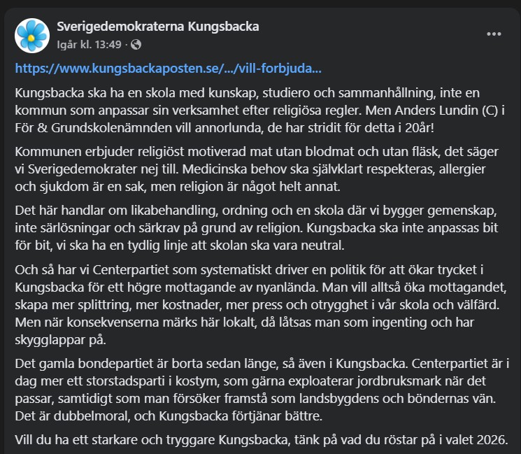 – Det här drabbar elever som äter enligt judisk och muslimsk tradition och är en fråga som inte borde kommit upp. SD hänvisar i sin motion till att dessa elever får ta med sig matlåda. Men det gynnar ju inte någon utan stöter istället bort elever, säger Peter Lundin (C), ledamot i för- och grundskolenämnden, till Kungsbacka-Posten.