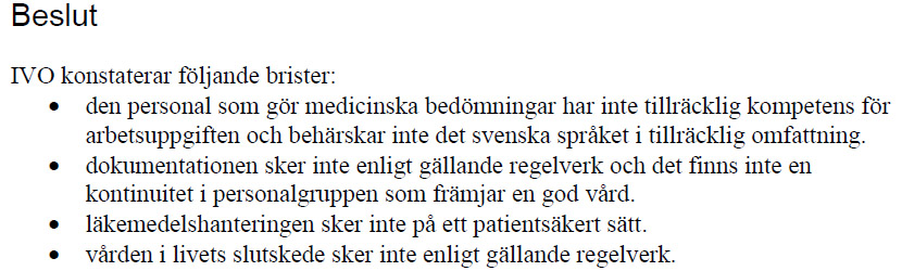 I samband med tillsynen i april förra året får kommunens sjuksköterskor också svara på en enkät. Av den framgår att samtliga tillfrågade sjuksköterskor ”ser patientsäkerhetsrisker avseende personalens kunskaper i svenska, vilket påverkar patienten i hög eller måttlig grad”.