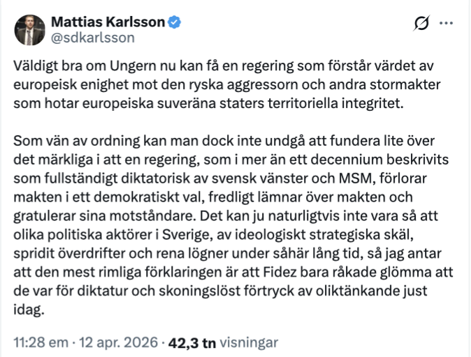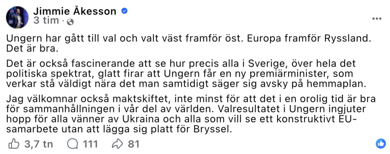 Sverigedemokraternas partiledare Jimmie Åkesson välkomnar maktskiftet i Ungern med EU-vänlige Péter Magyar som ny premiärminister. Enligt SD-ledaren inger valresultatet, där Viktor Orbán lämnar makten, nytt hopp om en stärkt europeisk enighet. Samma linje förs fram av flera andra tongivande företrädare för Sverigedemokraterna. Det gör även EU-kommissionens ordförande Ursula von der Leyen, som säger sig välkomna och fira valresultatet.