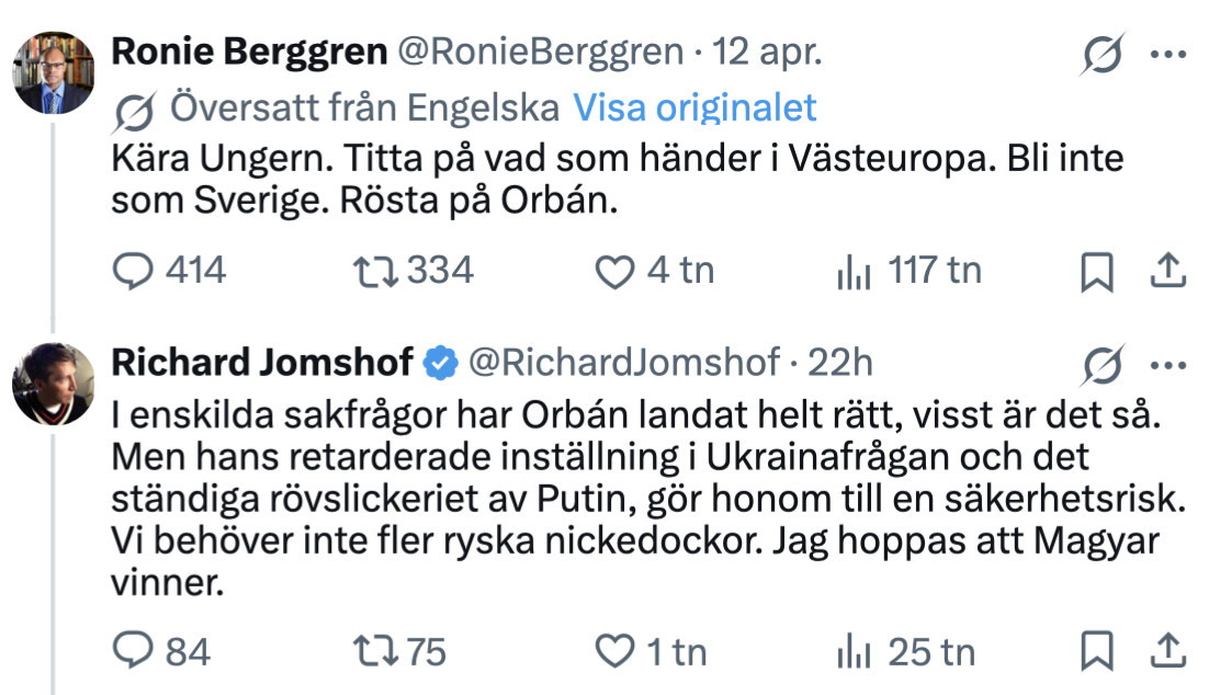 SD-toppen Richard Jomshof har, i ett svar till partikamraten och USA-kännaren Ronie Berggren, som uppmanat ungrare att rösta på Viktor Orbán, framhållit att den ungerske premiärministern visserligen har ”landat rätt i enskilda sakfrågor”, men att hans inställning i Ukrainafrågan gör honom till en säkerhetsrisk.