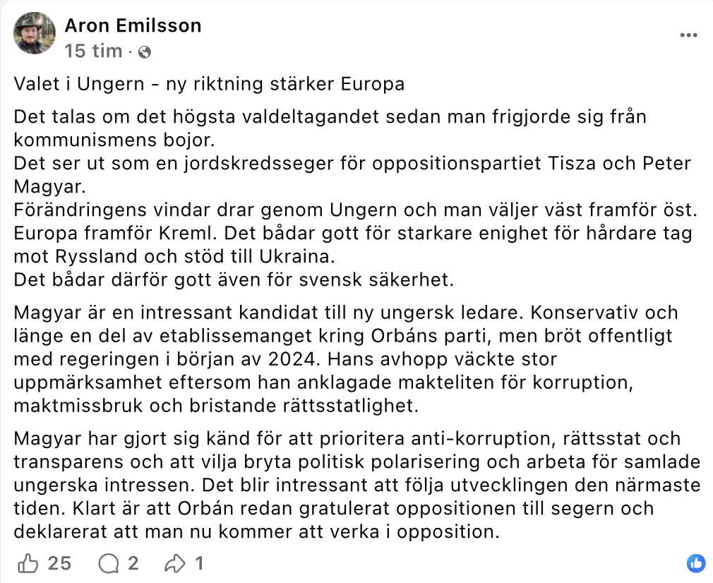 Emil Aronsson, partiets utrikespolitiske talesperson, välkomnar också valresultatet, om än i något mer nedtonade ordalag. ”Förändringens vindar drar genom Ungern”, konstaterar han.