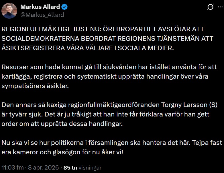 I Örebro håller en skandal på att nystas upp där de lokala socialdemokraterna tycks ha fört register över personer som på sociala medier på något sätt interagerat med inlägg från Örebropartiet med dess frispråkige partiledare Markus Allard i spetsen.