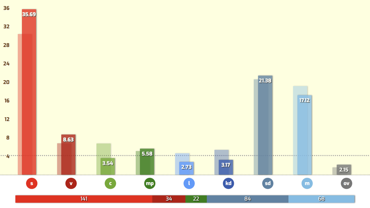 Enligt mätningen, som utförts på uppdrag av Riks, skulle Socialdemokraterna få hela 35,7 procent vid ett sådant val. Eftersom Centerpartiet, Kristdemokraterna och Liberalerna alla hamnar under riksdagsspärren, så skulle det innebära att S får 141 mandat.