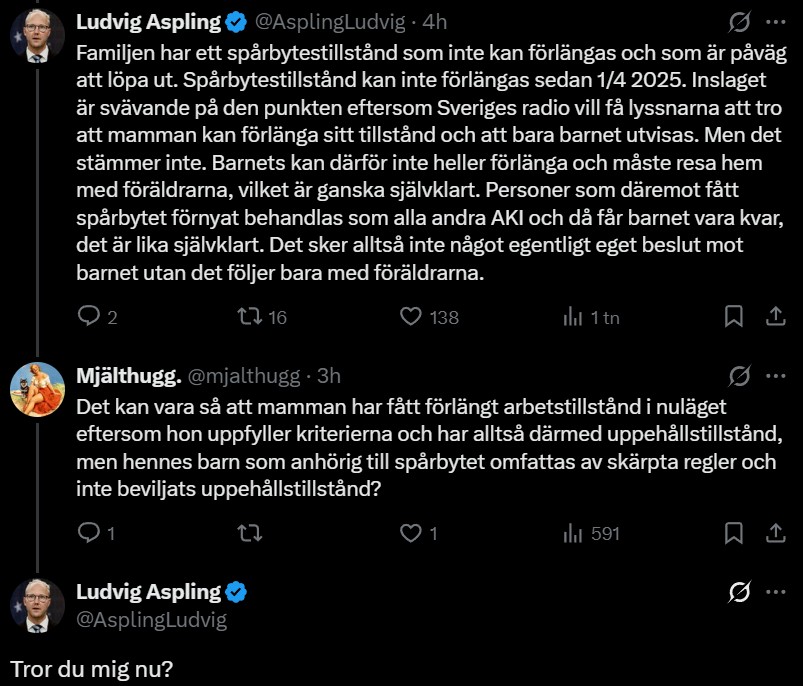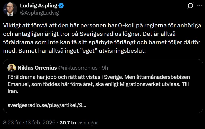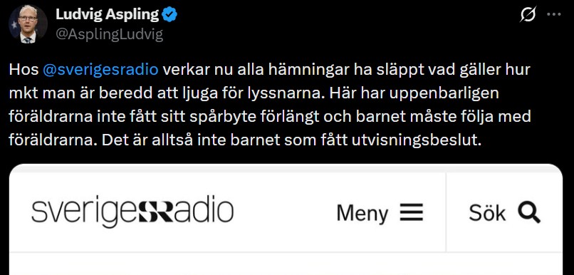 På X har en hetsig diskussion om ett utvisningsfall brutit ut efter att Sverigedemokraternas migrationspolitiska talesperson Ludvig Aspling kritiserat ett inslag i Sveriges Radio där man försöker förvanska fakta.