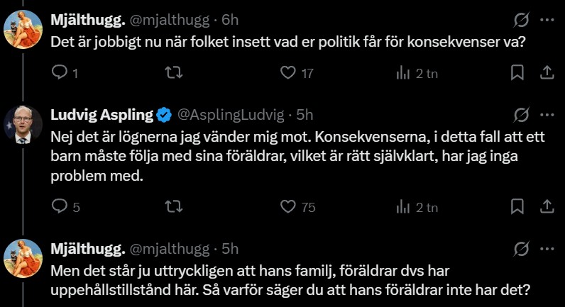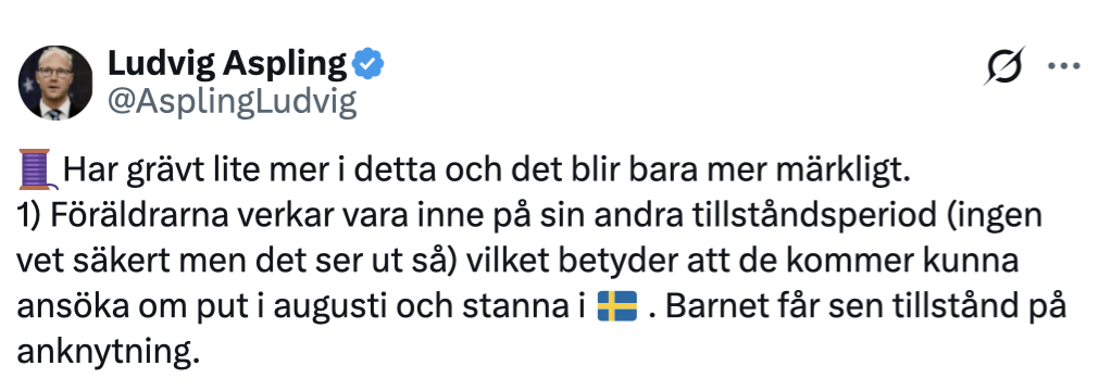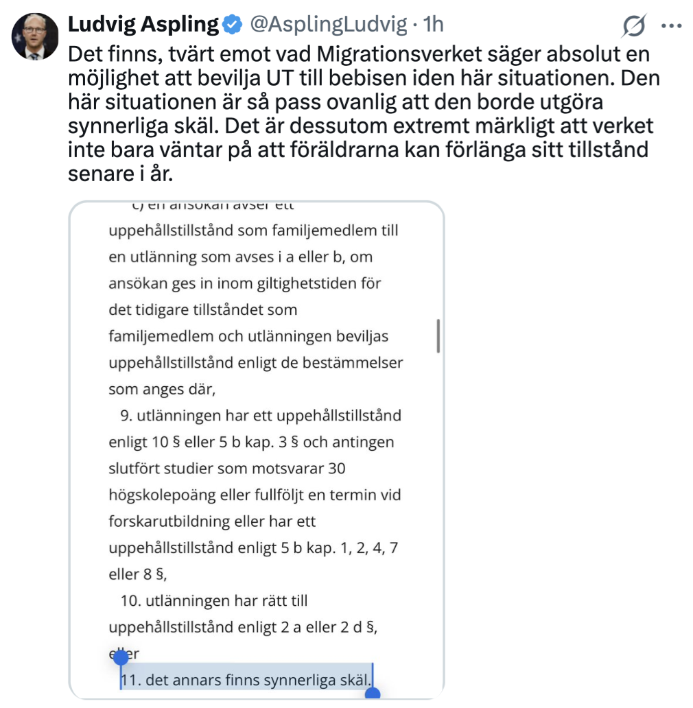 I en annan tråd på X skriver SD:s migrationspolitiska talesperson att det sannolikt finns en möjlighet att bevilja uppehållstillstånd för barnet i den här situationen, vilket står i kontrast till Migrationsverkets bedömning.