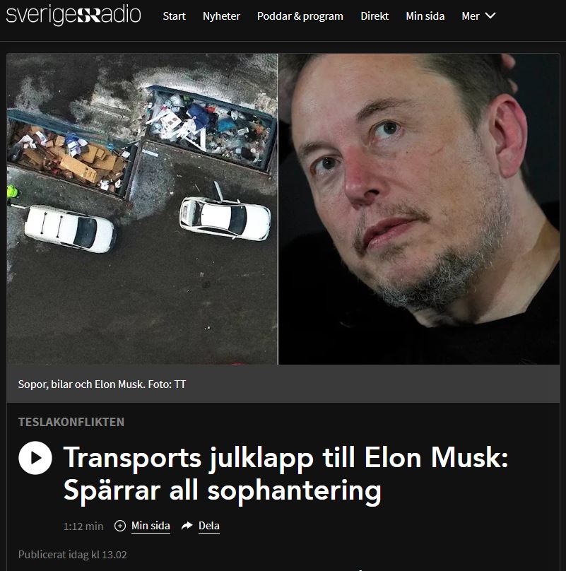 Med rubriken ”Transports julklapp till Elon Musk: Spärrar all sophantering” rapporterar statsradion att Transportarbetareförbundet nu varslar om ytterligare sympatiåtgärder till stöd för IF Metalls strejk.