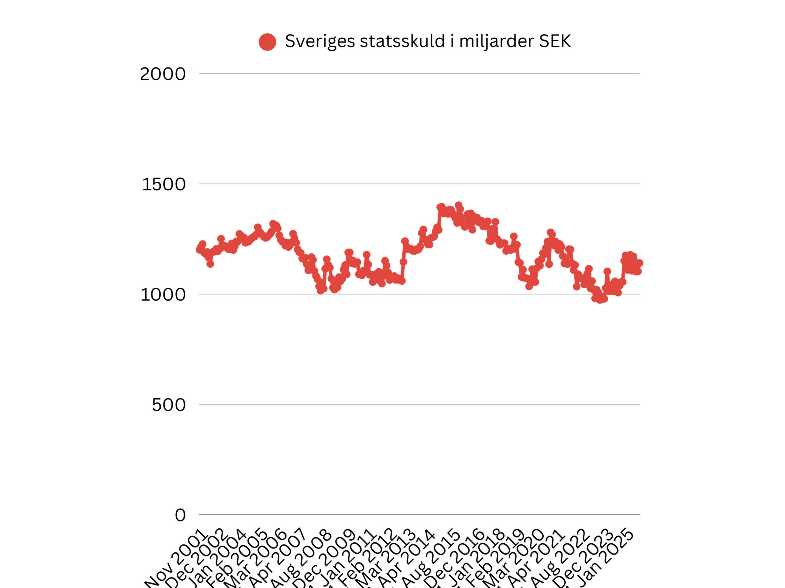 Som störst under 2000-talet var statsskulden i december 2015, under migrantkrisen. Då var svenska staten skyldig över 1 400 miljarder kronor.