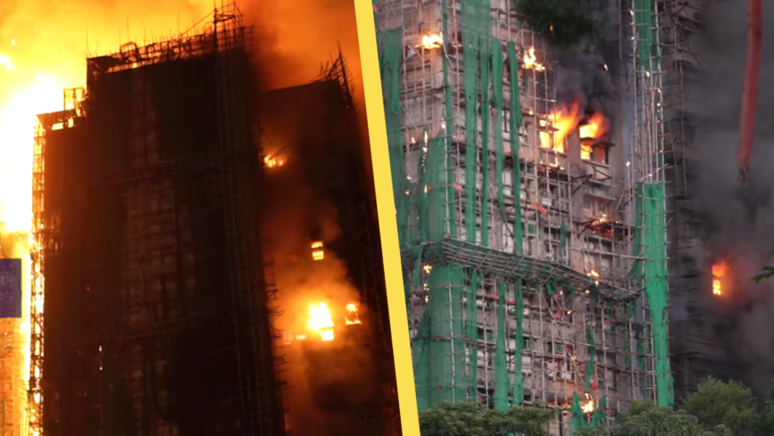 De första bilderna från branden visade bambuställningar utanför flera lägenheter som snabbt fattade eld och sedan helt uppslukades av höga eldpelare. Brinnande delar av grönt ställningsnät föll till marken.