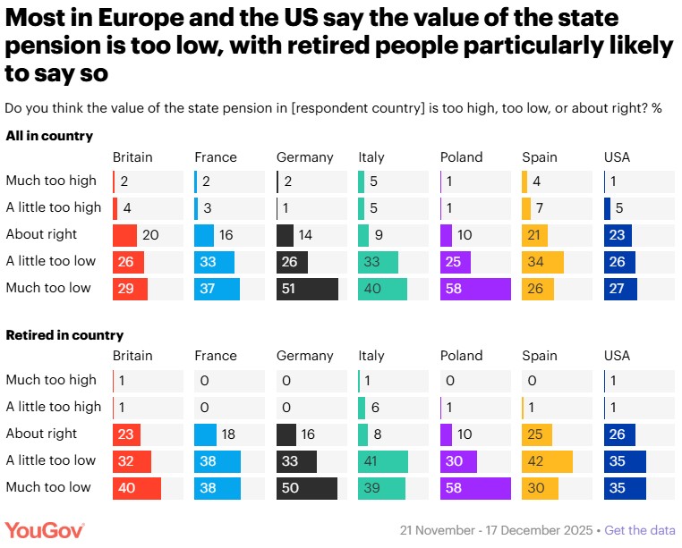 Utöver USA är länderna som ingår i Yougovs undersökning Storbritannien, Frankrike, Tyskland, Italien, Polen och Spanien. En majoritet i samtliga länder tycker att den statliga pensionen är för låg men graden av missnöje skiljer.