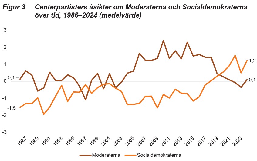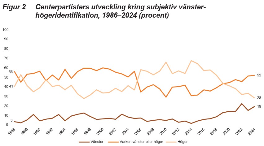 I dag placerar sig 52 procent av Centerpartiets väljare varken till höger eller vänster, vilket är en ökning med 22 procentenheter på tio år. Samtidigt har andelen som placerar sig till höger minskat med 40 procentenheter från 68 procent 2015 och ligger i dag på 28 procent.