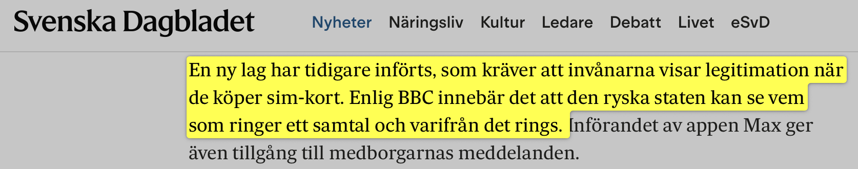 För att understryka bilden av att friheten krymper ytterligare i öst påpekar SvD, med hänvisning till BBC, att Ryssland har förbjudit möjligheten att använda kontantkort anonymt – det vill säga att alla numera måste registrera sina kontantkort för att kunna ringa eller skicka meddelanden via telefonnätet.