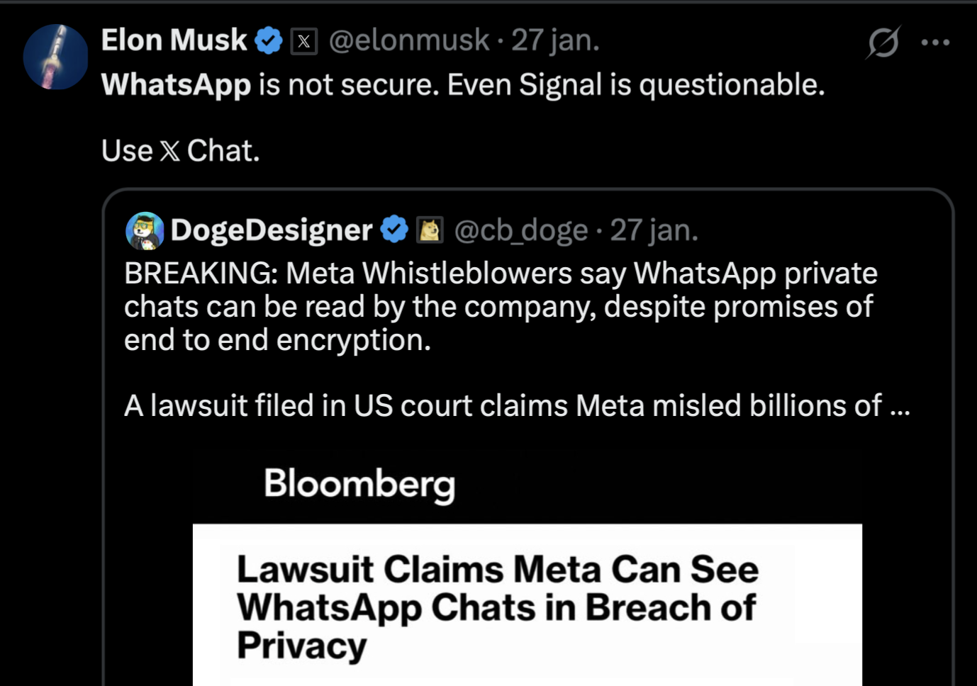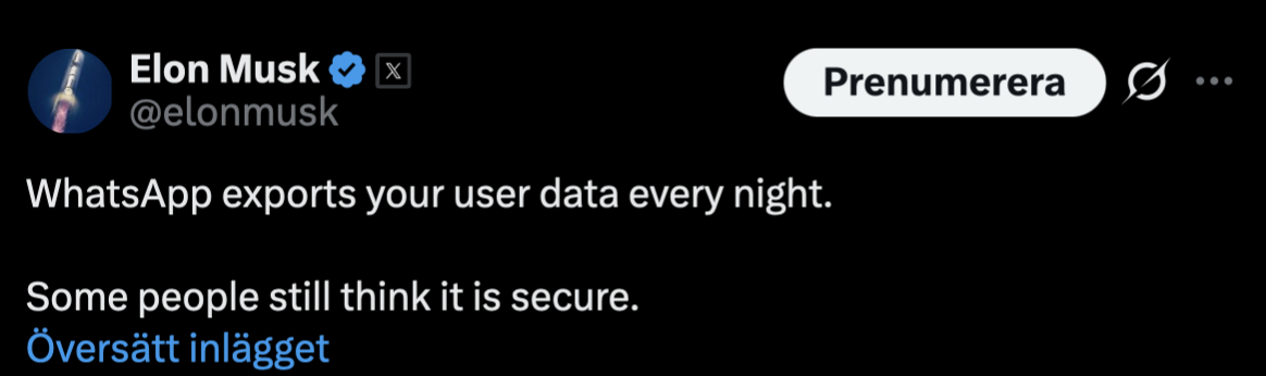 Även i väst är det långt ifrån odiskuterat hur säkra stora amerikanska meddelandetjänster egentligen är. Tesla- och X-ägaren Elon Musk har flera gånger kritiserat WhatsApp och dess ägarbolag Meta, och menat att tjänsten inte är så privat som många tror. Musk hävdade till exempel på sociala medier att “WhatsApp exporterar användardata varje natt”, och ifrågasatte därmed appens säkerhet och hur företaget hanterar användarinformation – en kritik som lyfter fram farhågor om att kommunikationsdata används för annat än bara krypterad meddelandehantering.