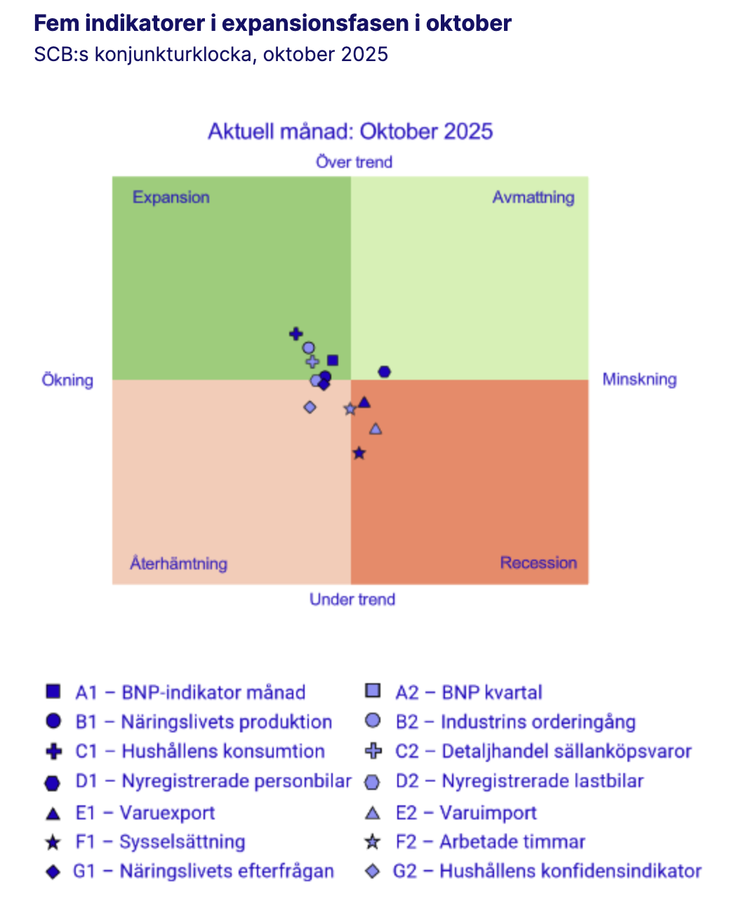 Enligt SCB visar konjunkturklockan fortsatt rörelse mot en starkare konjunktur. I oktober 2025 befann sig fem indikatorer i expansionsfasen. De tydligaste förändringarna jämfört med tidigare månader gällde hushållens konsumtion samt industrins orderingång.