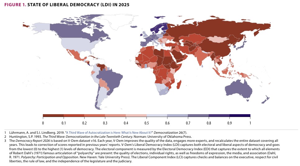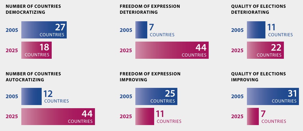 När den senaste mätningen nu presenteras hävdas att nästan en fjärdedel av världens länder under fjolåret befann sig i en demokratisk tillbakagång. Samtidigt pekas tio nya autokratiserande länder ut varav sex i Europa och Nordamerika. Bland dessa finns länder som Italien, Storbritannien och USA. Det hävdas också att media och journalister över hela världen är alltmer utsatta.