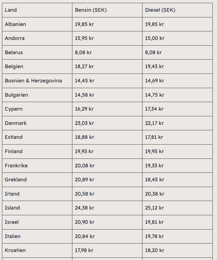 För de familjer som planerar att bila genom Europa på sportlovet ser bensinpriserna per liter ut så här i några populära länder: