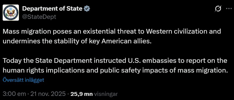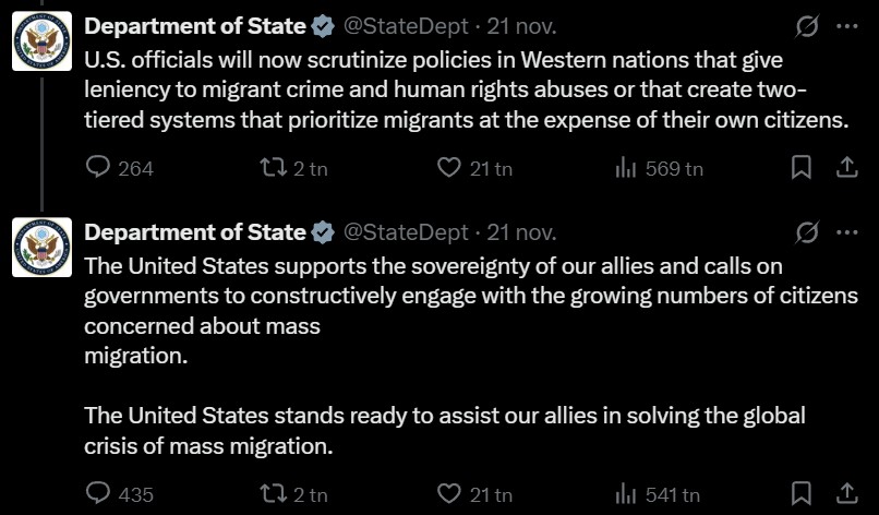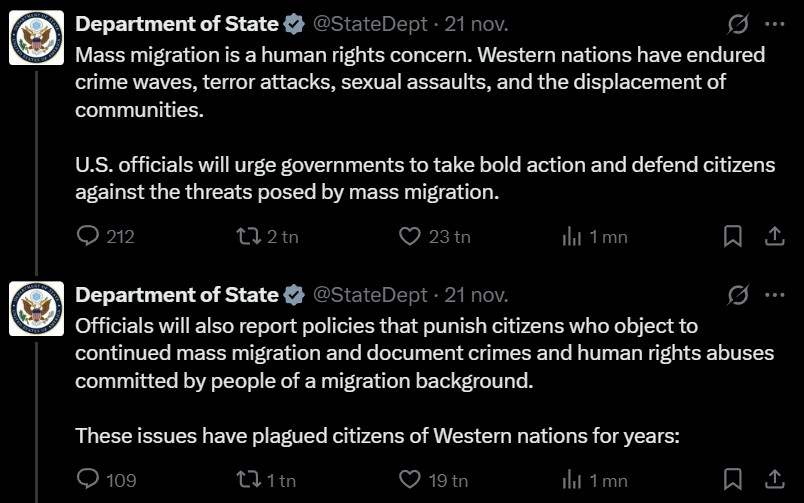 Massinvandring utgör ett existentiellt hot mot den västerländska civilisationen och undergräver stabiliteten hos USA:s allierade och konsekvenserna av de öppna gränserna måste utredas. Det meddelar amerikanska utrikesdepartementet.