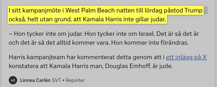 Vidare framförde SVT att det inte kan vara på det viset som Trump påstår. Detta eftersom Harris är gift med en judisk man – Douglas Emhoff.