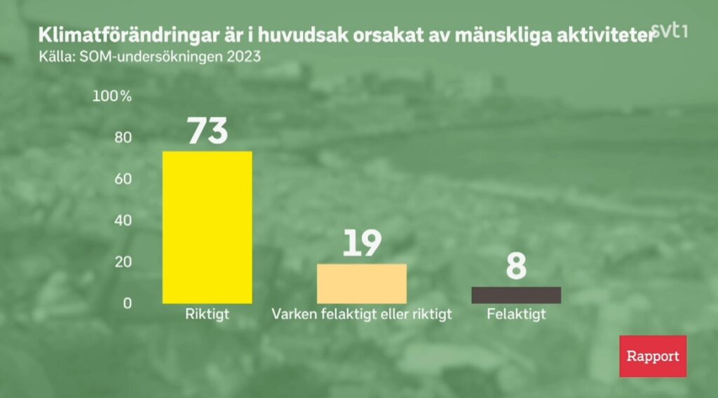 Att inte tillräckligt många delar statstelevisionen åsikter i frågan utgör grunden i det reportage som sändes på söndagen. Där hänvisar man till SOM-undersökningen 2023 och att ”bara” 73 procent av de tillfrågade håller med om påståendet att klimatförändringarna i huvudsak är orsakade av mänskliga aktiviteter.
