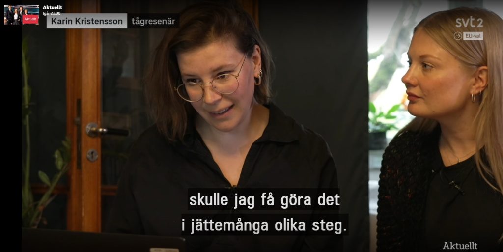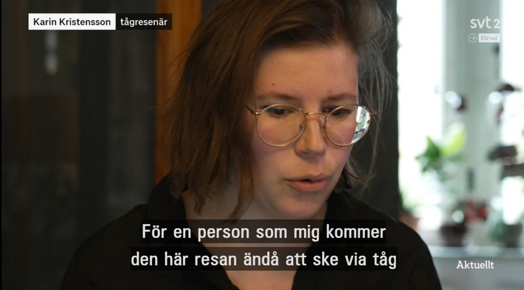 Vidare har SVT intervjuat ”tågresenären Karin Kristensson” och hon är besvärad över att det är krångligt att boka tågresor i Europa. Enligt Kristensson kan det göra att många väljer bort tåget som ett alternativ vid resor i Europa.