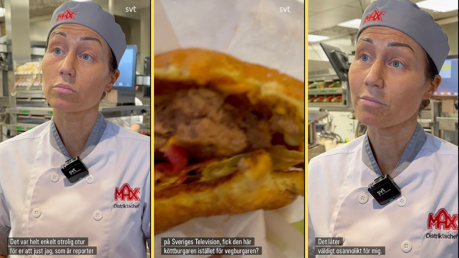 Statstelevisionen har gjort en stor sak av att en av deras egna reportrar, som har varit vegetarian i över 30 år, råkade få en köttburgare i stället för sin vegoburgare vid ett besök på Max i Gävle. Reportern, som drabbades av misstaget, återvände senare till restaurangen tillsammans med ett team för att konfrontera ansvarig chef – något som skedde på skattebetalarnas bekostnad.