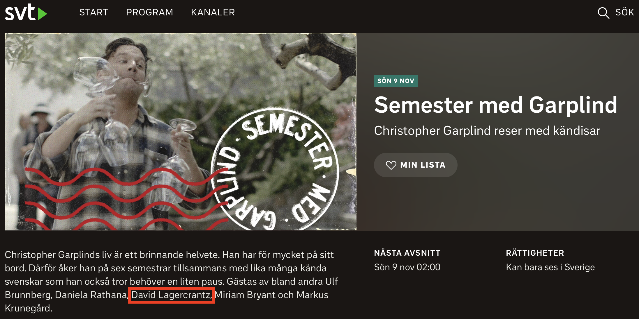 Nu skapar Sveriges Television ett exklusivt reseprogram där vd:n Anne Lagercrantz låter sin make, författaren David Lagercrantz, ingå som deltagare. Allt på skatte­betalarnas bekostnad. Kritiker inom media kallar tilltaget för ”fullständigt skandalöst”.