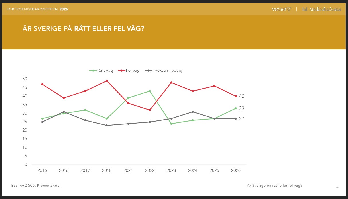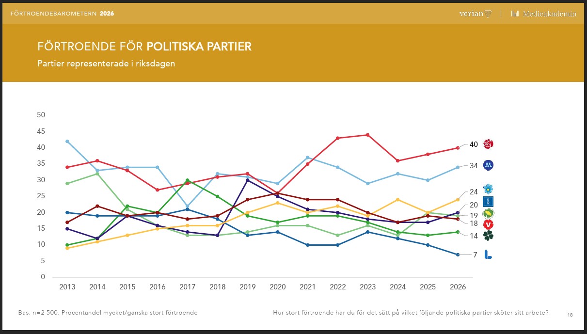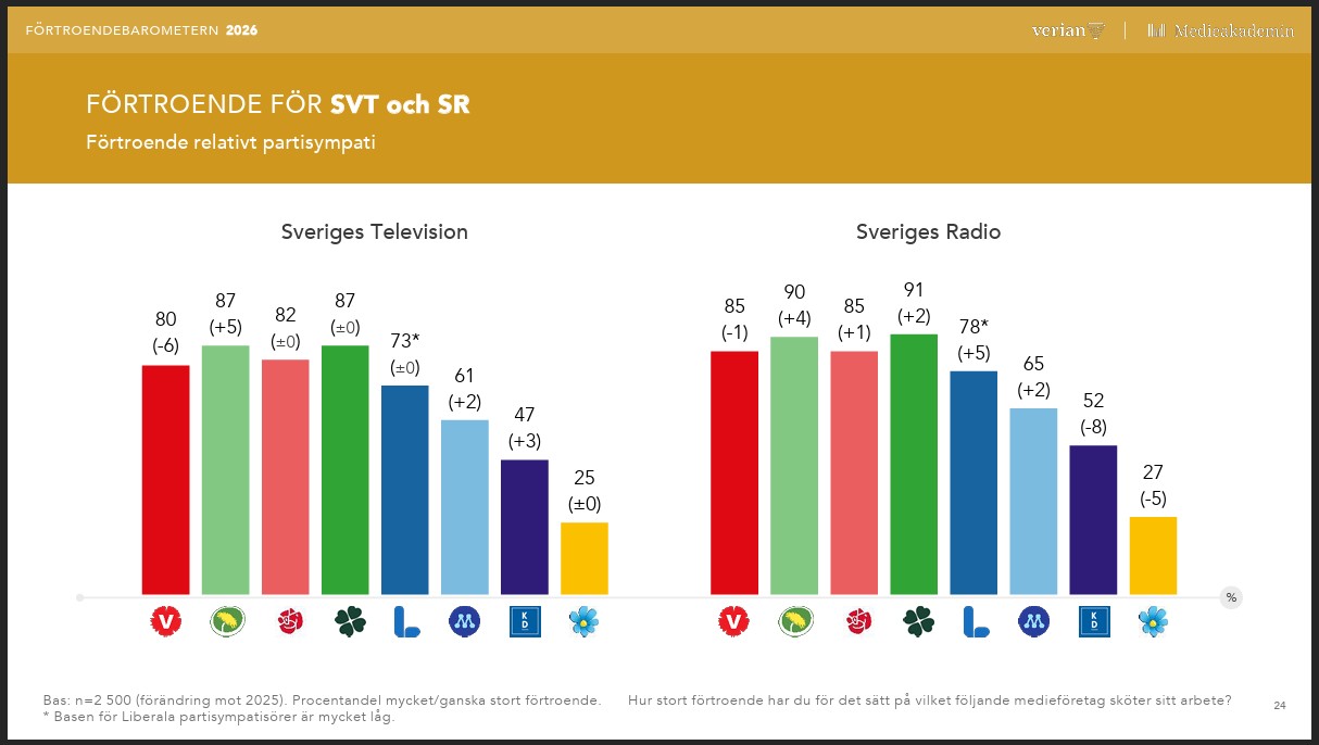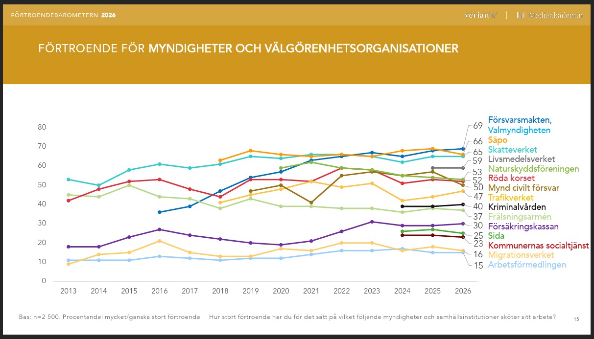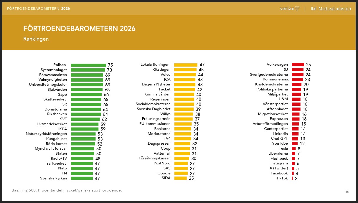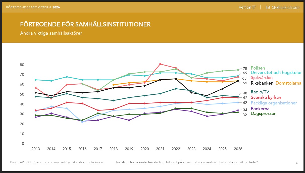 Medieakademins Förtroendebarometer har genomförts varje år sedan 1997 och 2026 års undersökning omfattar 2 500 onlineintervjuer med personer i åldern 16-84 år. Svaren samlades in mellan 19 januari och 2 februari i år. Årets mätning är en av de mest omfattande hittills.
