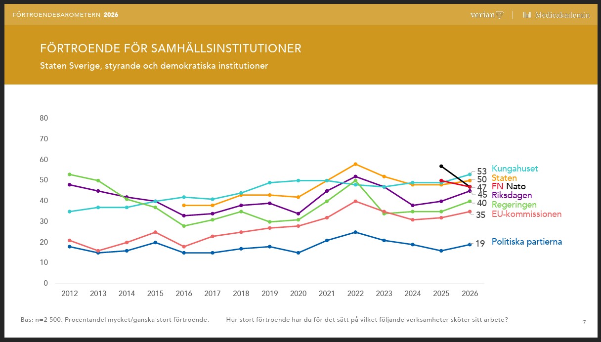 Medan kungahuset får sin högsta notering någonsin ser det desto värre ut för Nato som tappar tio procentenheter. Även för de politiska partierna och regeringen samt staten som helhet ökar förtroendet liksom framtidstron (plus åtta procentenheter).