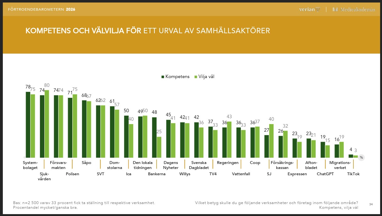 En helt ny aspekt på förtroende som ingår är vilket betyg allmänheten ger olika samhällsaktörer vad gäller kompetens och vilja väl: