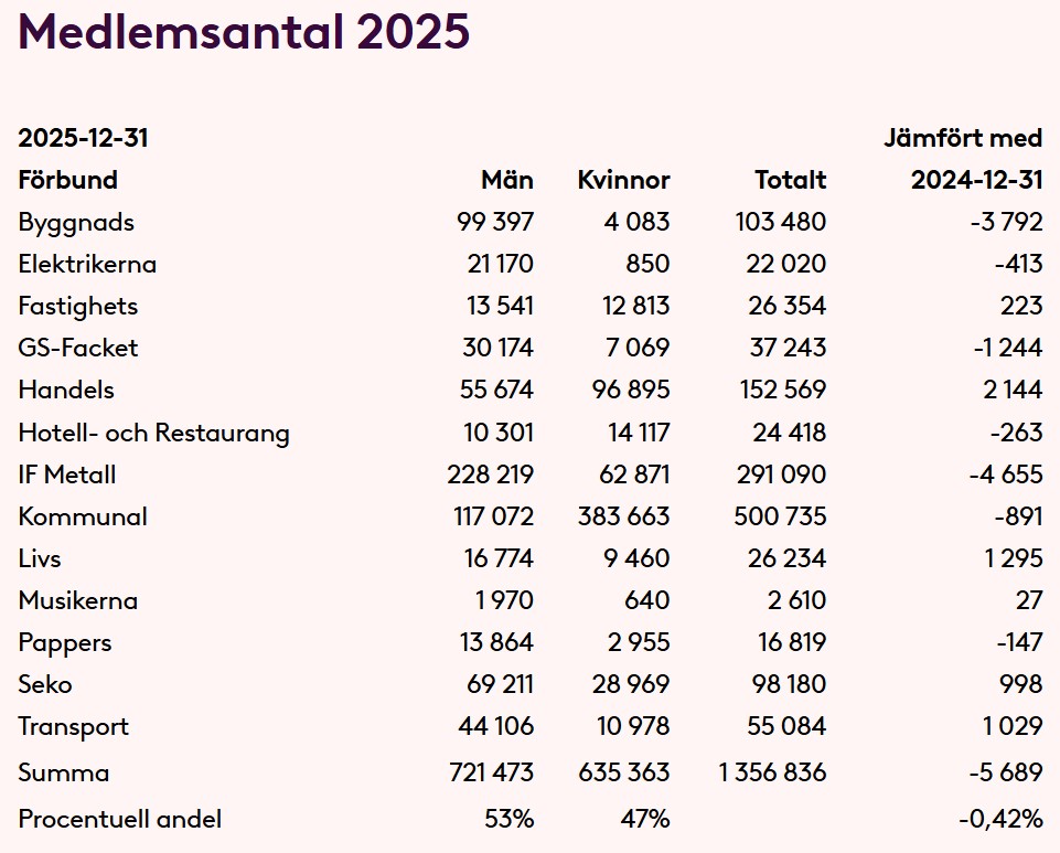 2025 tappade LO-förbunden 5 689 medlemmar och drygt 80 procent av dessa tillhörde IF Metall. Det är ungefär lika många som man tappade 2024.