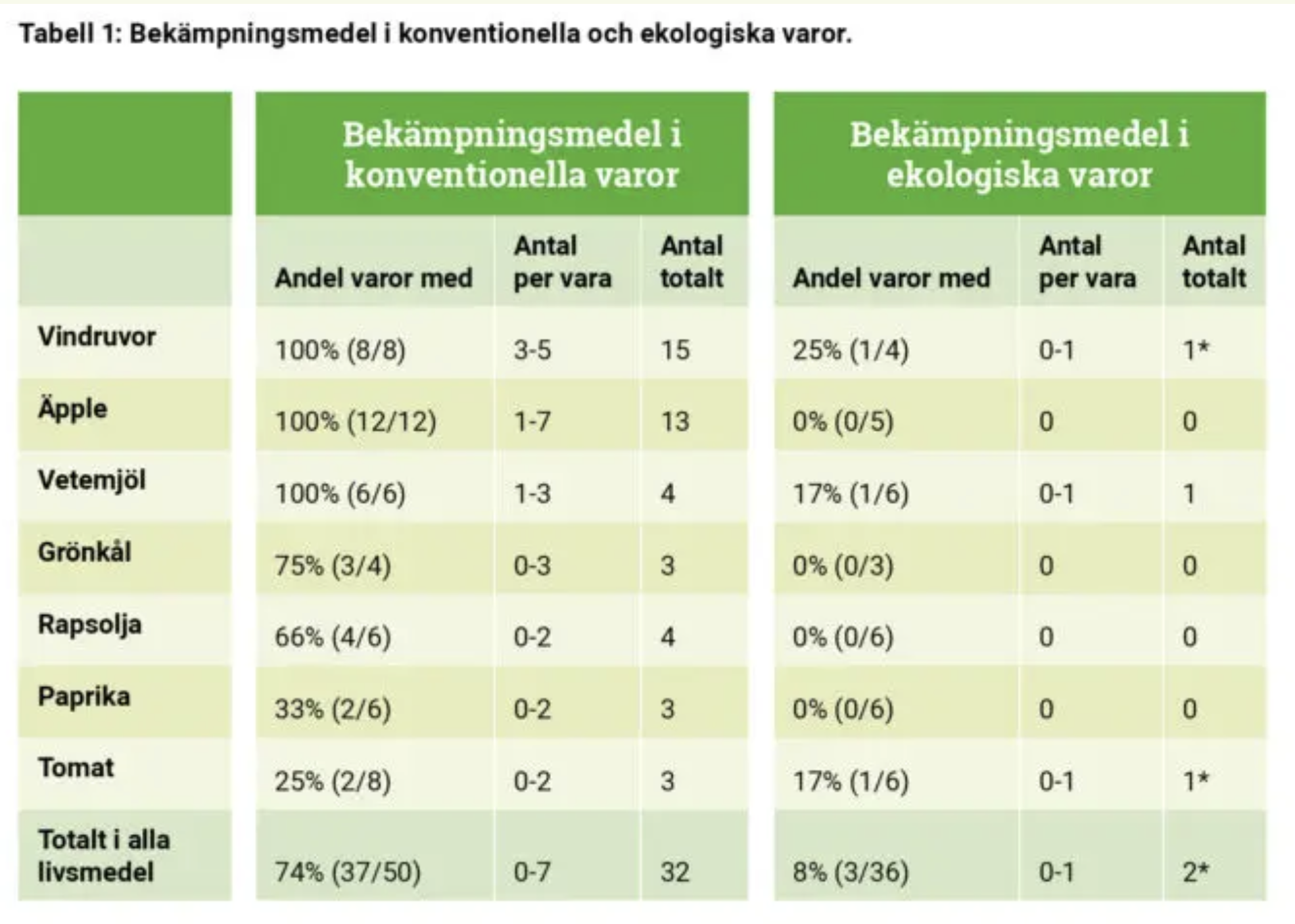 Analysen visar att 74 procent av den konventionellt odlade maten innehöll rester av bekämpningsmedel, medan motsvarande siffra för ekologiska produkter var åtta procent. Ekologiskt odlade livsmedel framställs utan kemiska bekämpningsmedel och konstgödsel, vilket gör att risken för rester blir betydligt lägre.