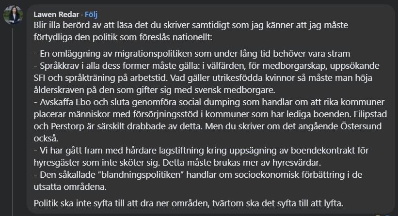 Även Redar har uppmärksammat Widéns inlägg och har skrivit en kommentar. I denna heter det bland annat att hon ”blir illa berörd av att läsa det du skriver” samtidigt som hon ”måste förtydliga den politik som föreslås nationellt”.