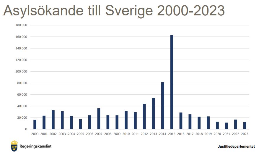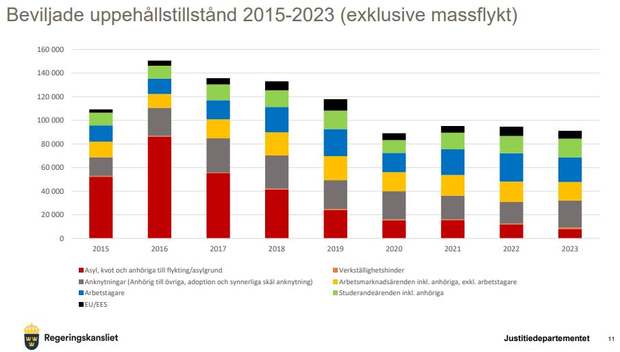 Antalet beviljade uppehållstillstånd av asylskäl – åtta procent av det totala antalet – låg i fjol på den hittills lägsta nivån under hela 2000-talet, en utveckling som regeringen menar måste fortsätta. Samtidigt påpekar Malmer Stenergard att minskningen skedde 2023 utan att några större beslut ännu hade hunnit träda i kraft.