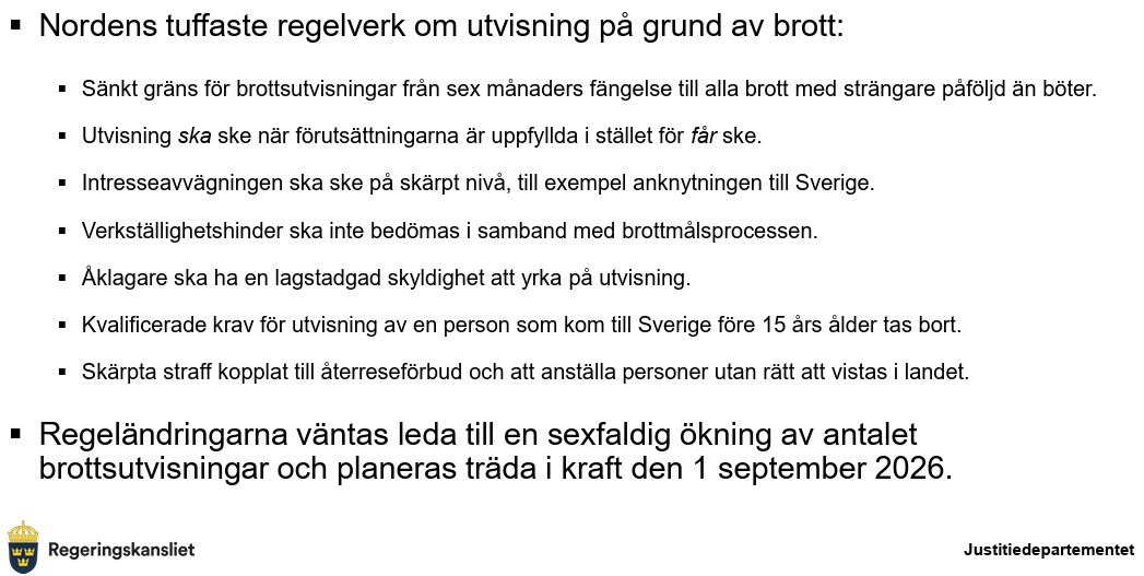 På torsdagen kommer Tidöregeringen att besluta om en lagrådsremiss med förslag som kommer göra det lättare att utvisa utländska medborgare som begår brott. Syftet är att stå upp för en reglerad och rättvis migrationspolitik som prioriterar brottsoffrens och hederliga människors trygghet. Lagförslagen väntas leda till att antalet brottsutvisningar sexfaldigas.