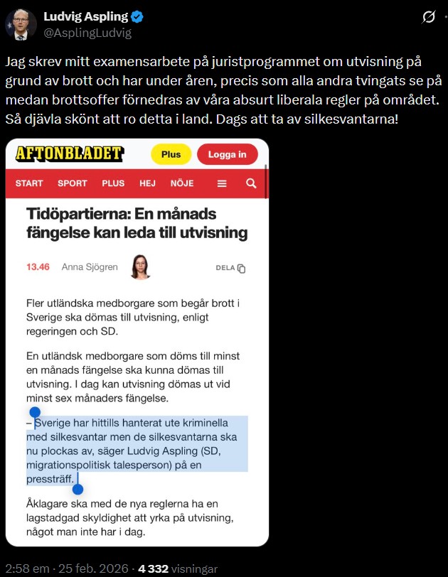 – Under alldeles för lång tid har grovt kriminella och samhällsfarliga utlänningar tillåtits kvarstanna trots att de dömts för grova brott. Med dessa krafttag ser vi nu till att ändra på detta och säkerställer att vi upprätthåller svenska folkets förtroende för rätts- och migrationssystemet, säger Ludvig Aspling, migrationspolitisk talesperson för Sverigedemokraterna.