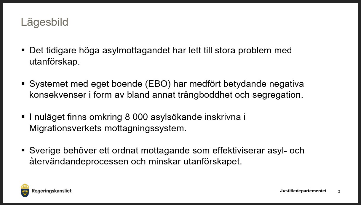 – Som ytterligare steg i att effektivisera asyl- och återvändandeprocessen ser vi nu till att införa ytterligare skärpningar av regelverket. Den tidigare ordningen där asylsökande kunnat ordna sin egen bostad och själv välja bostadsort har bidragit till de stora integrationsproblemen i Sverige, vilket är en av de saker vi nu ser till att förändra, säger Ludvig Aspling, migrationspolitisk talesperson för Sverigedemokraterna.