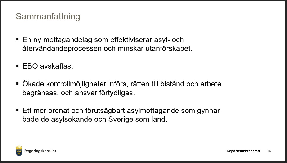 Sverigedemokraterna beskriver den nya mottagandelagen, som föreslås träda i kraft den 1 oktober i år, som att Sverige nu tar ett tydligt steg mot EU:s mest restriktiva migrationspolitik. Syftet är att skapa ett tydligare och mer sammanhållet regelverk genom hela mottagandeprocessen och förbättra förutsättningarna för ett ordnat mottagande samt en effektivare återvändandeprocess och att minska utanförskapet.