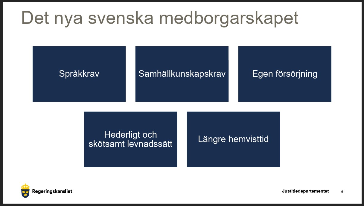 Måndagens besked avser skärpningar för medborgarskap och att det i fortsättningen ska krävas mer för att bli svensk medborgare.