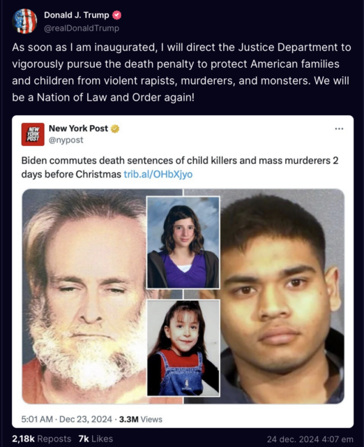 Det är i ett inlägg på plattformen Truth Social som Trump berättar att han kommer uppmana justitiedepartementet att kraftfullt arbeta för dödsstraff för att skydda amerikanska familjer och barn från våldtäktsmän, mördare och monster.