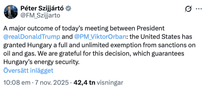 På fredagen tog USA:s president Donald Trump emot Ungerns premiärminister Viktor Orbán för möten om att undantas från sanktioner vid fortsatt köp av rysk olja och gas, men även för att diskutera kriget i Ukraina och möjligheten till ett framtida möte mellan Trump och Putin i Ungern. Trump passade dessutom på att berömma Orbán för att ha gjort allt rätt i sin motståndshandling mot invandring, samtidigt som han menade att övriga EU har gjort allt fel och i själva verket idag är avundsjuka på Orbán.