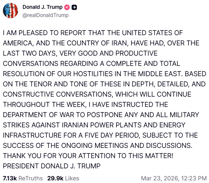 Vidare skrev Trump att baserat på ”tonen i dessa djupgående, detaljerade och konstruktiva samtal”, vilka kommer att fortsätta under veckan, har han skjutit upp alla militära angrepp mot Iran och landets kraftverk och energiinfrastruktur i fem dagar ”under förutsättning att de pågående mötena och diskussionerna lyckas”.