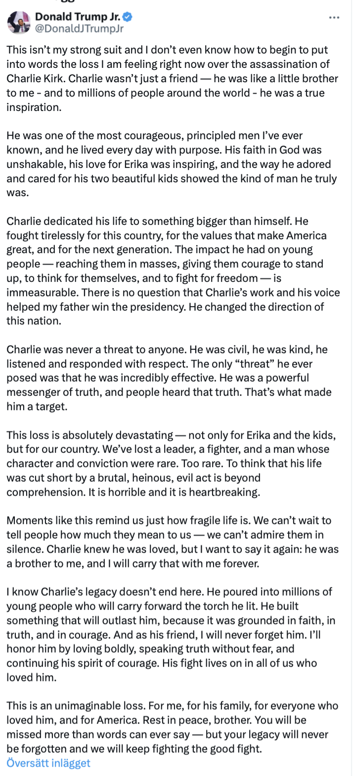 Charlie Kirk stod Trump-familjen nära. Den amerikanske presidentens son Donald Trump Junior har publicerat ett långt inlägg på sociala medier om Kirk.