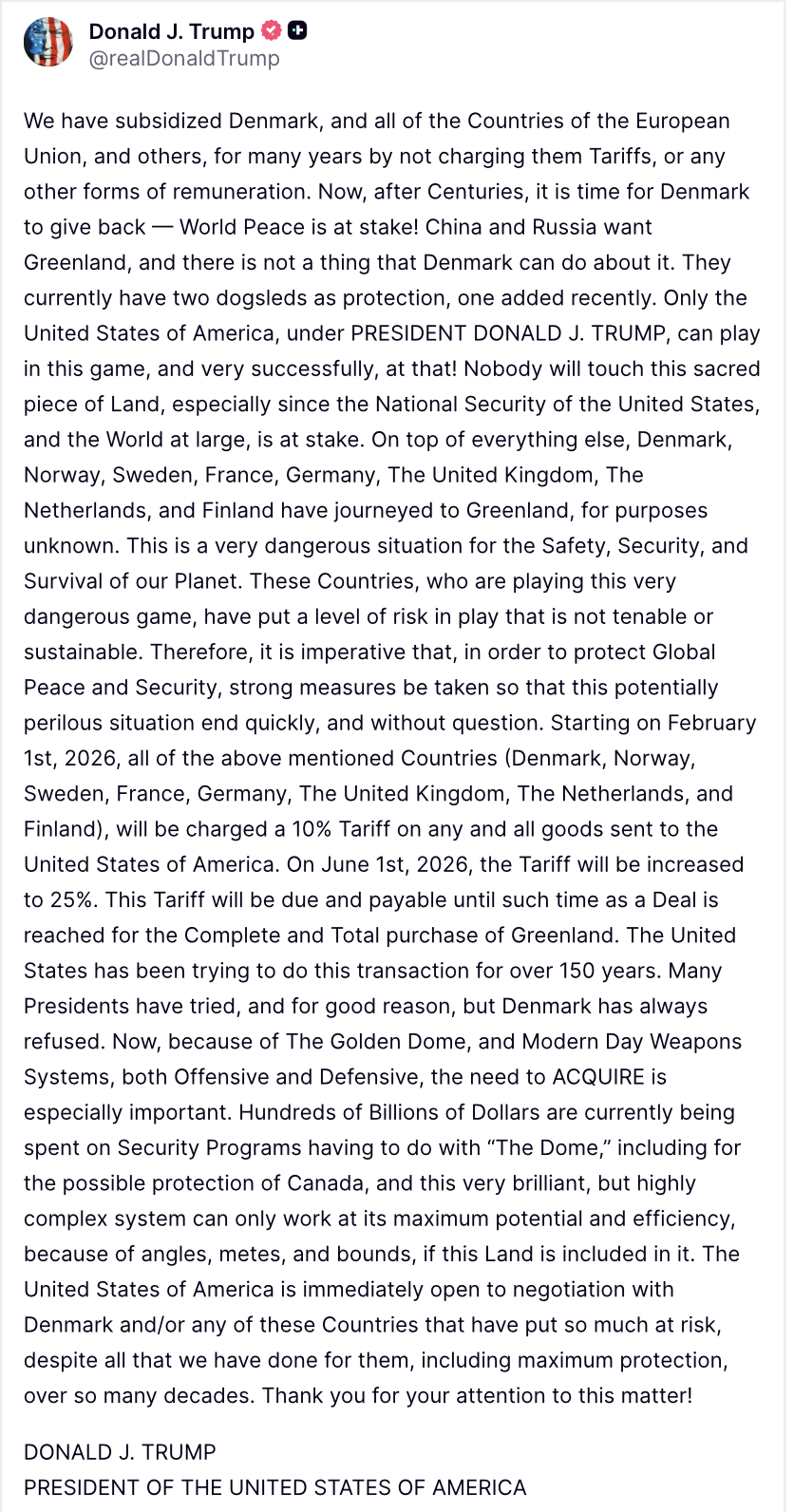 USA:s president Donald Trump meddelar att han nu tänker verkställa sina hot mot europeiska länder som stöttar Danmark i frågan om Grönland, som han vill annektera. Sverige och flera andra länder i Europa kommer att drabbas av nya amerikanska tullar, som ett straff för att de trotsar hans vilja och står fast vid att han inte kan ta över ön. Enligt Trump handlar det om både ”vår planets överlevnad” och ”världsfreden”. Av den anledningen menar han att USA måste få annektera Grönland och införliva ön som en del av sitt missilförsvar.