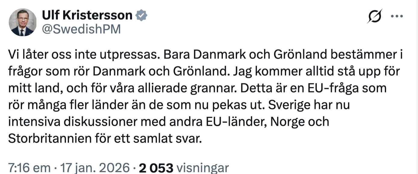 Sveriges statsminister Ulf Kristersson har kommenterat Trumps utspel på sociala medier under lördagskvällen. Han slår fast att enbart Danmark och Grönland bestämmer över den arktiska ön och inte Trump.