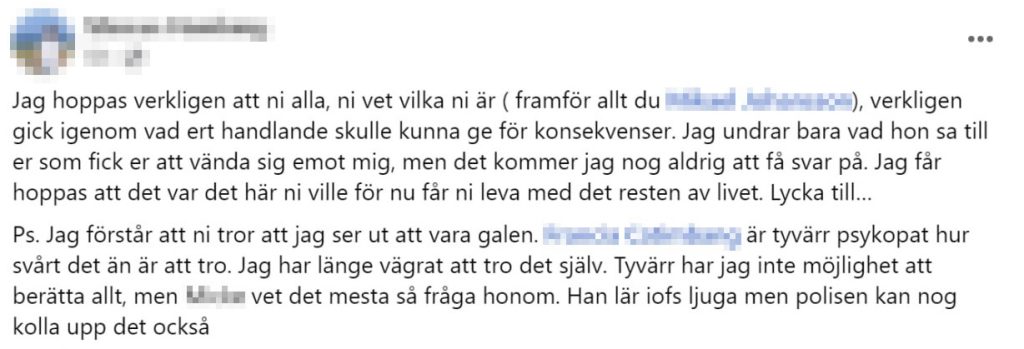 ”Jag får hoppas att det var det här ni ville för nu får ni leva med det resten av livet. Lycka till…” står bland annat i inlägget, samt: ”Jag förstår att ni tror att jag ser ut att vara galen.”