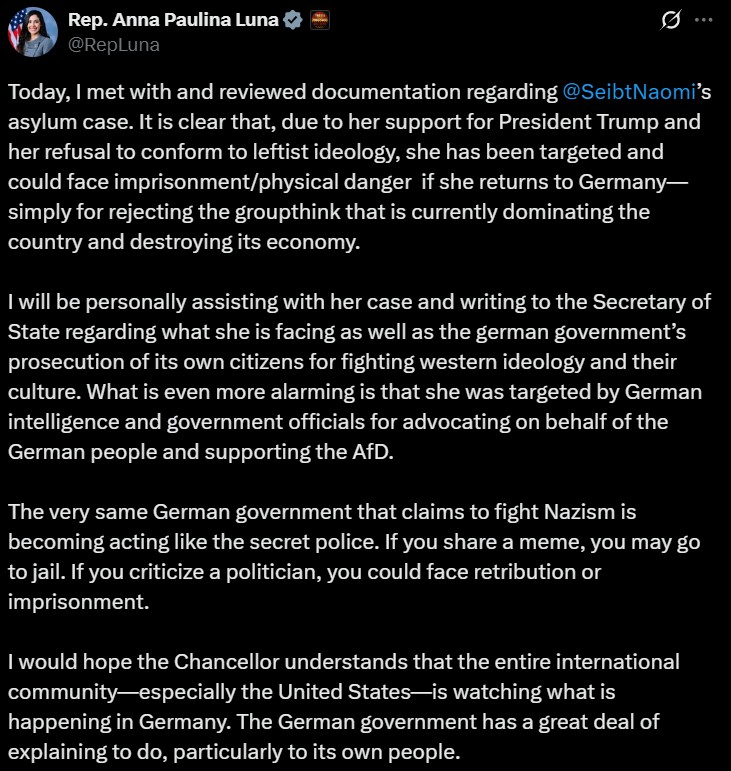 På torsdagen meddelade den republikanska kongressledamoten Anna Paulina Luna att hon mött tyska Naomi Seibt för att titta närmare på hennes asylansökan. I Tyskland och Europa säger sig Seibt vara förföljd av våldsamma vänstergrupper och smutskastas av media för sitt stöd till nationalkonservativa AfD och Trump.