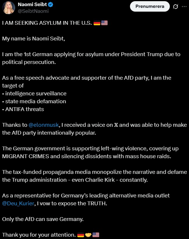 I ett inlägg på X anklagar Seibt den tyska staten för att stödja vänstervåld, mörklägga migranters brottslighet och tysta dissidenter. Bara AfD kan rädda Tyskland, är hennes bedömning: