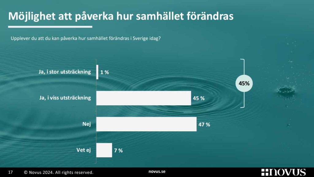 Man tycker dessutom bara att man har den möjligheten ”i viss utsträckning”. Den andel av svenskarna som tycker att de har stor möjlighet att påverka inskränker sig till en enda procent.