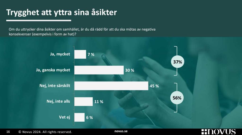 I Förändringsrapporten 2024 framkommer också att fler än var tredje svensk (37%) inte vågar engagera sig politiskt av rädsla för negativa konsekvenser, att bli föremål för repression, hets och hat med mera om de uttrycker ”fel” åsikter om samhället.